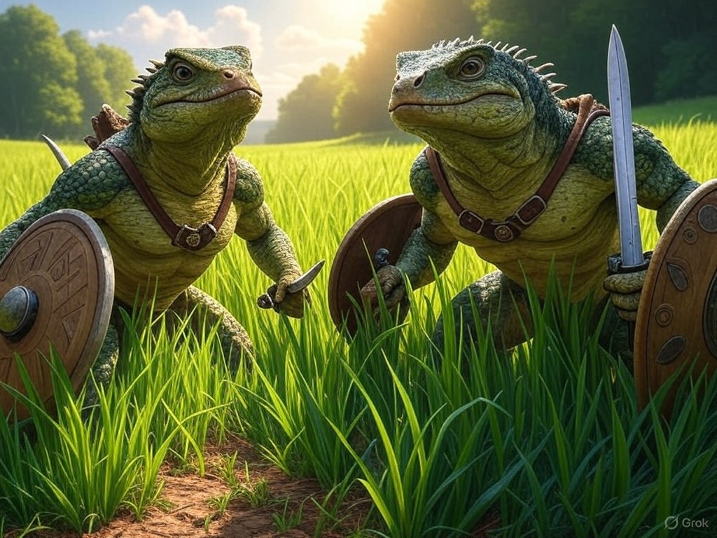 Instead of being attacked by the Were-Beagle, the strong Lizardfolk cut into Ookla with a stabbing spear, while warrior Tharn traded blows against his opponent’s shield and took one on his own shield, neither side taking damage.