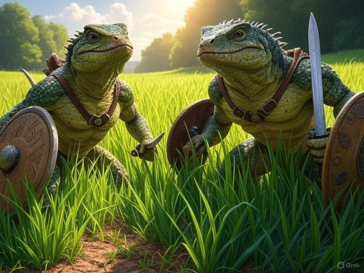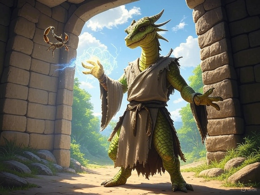 “Ye big lizards picked the wrong family to mess with!” Thudbutt taunted, then casting Vicious Mockery on a Lizardfolk. “Ye’re so slow, a snail could outrun ye!” The Lizardfolk roared but Ookla stood in its way, as Skip cast his attempt on the hideous laughter against the other one, but got unlucky as the Lizardfolk resisted the spell entirely. Back near the house, one of the hidden kobolds launched some kind of scorpion right at the Dragonborn, hitting him square and seeing him fall over from damage and poison.