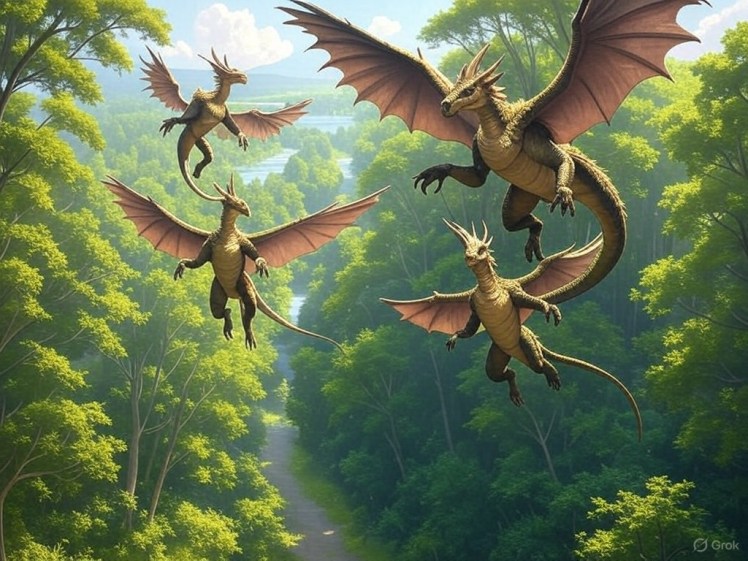 Out above the trees, half-blinded in the brilliant morning sunshine, came four winged kobolds (plus one other one limping along, bleeding like they’d already been in a fight!) They failed to target us (too bright for them, as we all hid behind the trees) and we launched some attacks on the invaders. (Ookla hurled a rock, others shot arrows or hurled spells based on insults and mockery, as the kobolds wildly overshot and missed with their slings.)